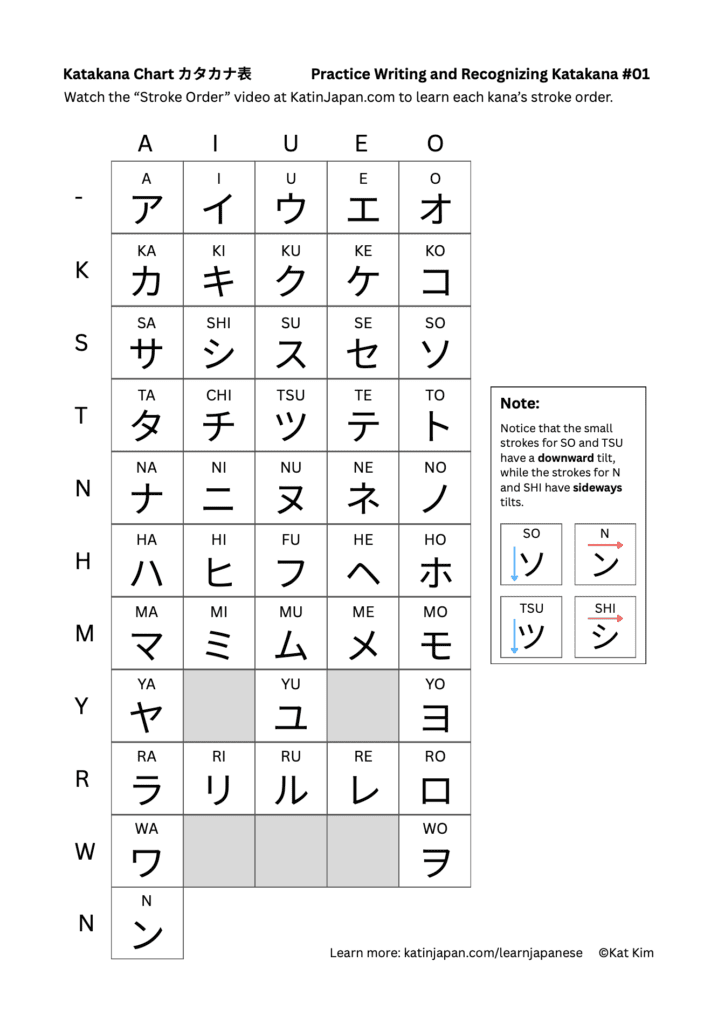 This chart covers all 46 basic katakana characters. Similar to how the English alphabet has its own order (a, b, c, d, etc.), the katakana syllabary is ordered “a, ka, sa, ta, na, ha, ma, ya, ra, wa, n”.